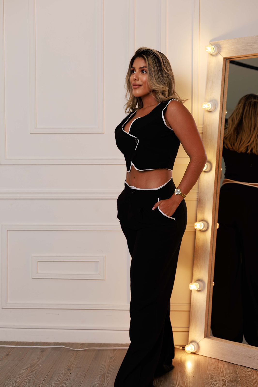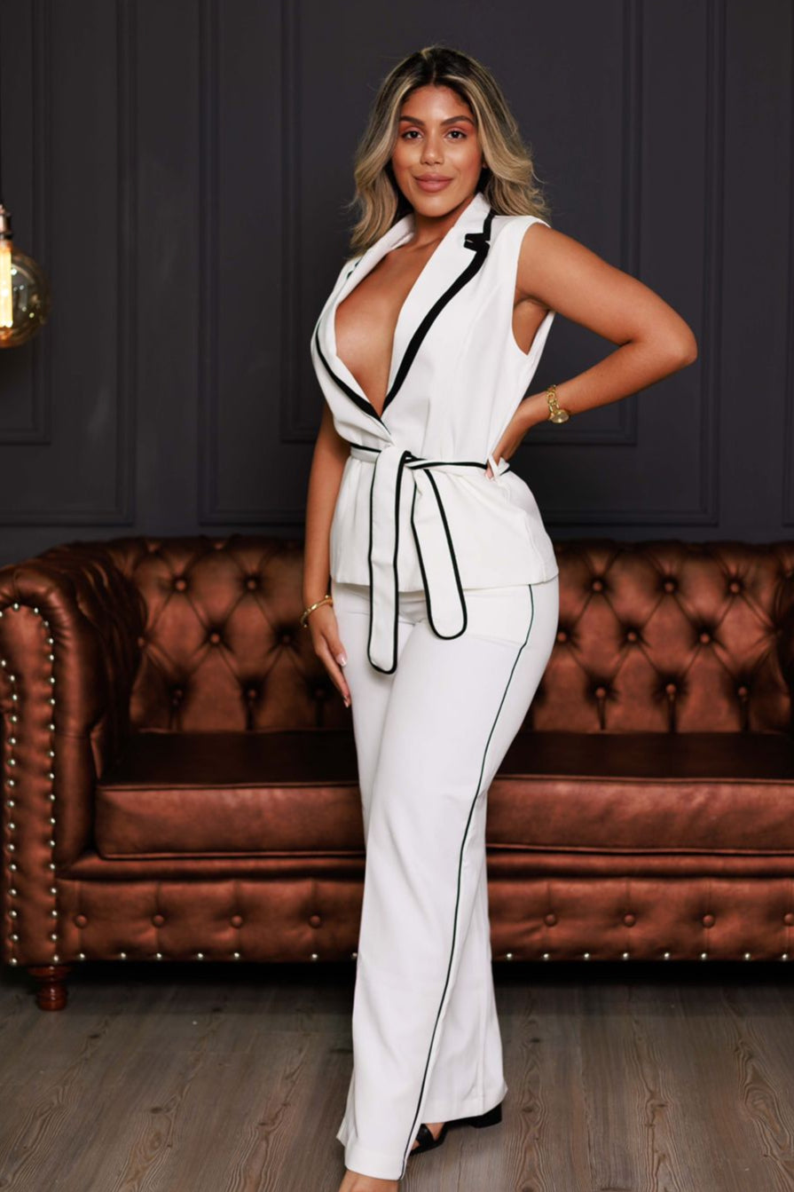 Nuestro Set Kotor blanco es un elegante diseño que realza tu fuerza y estilo. Chaleco sin mangas con cinturón y pantalón recto con detalles blancos, ideal para mujeres seguras que desean destacar con sofisticación.